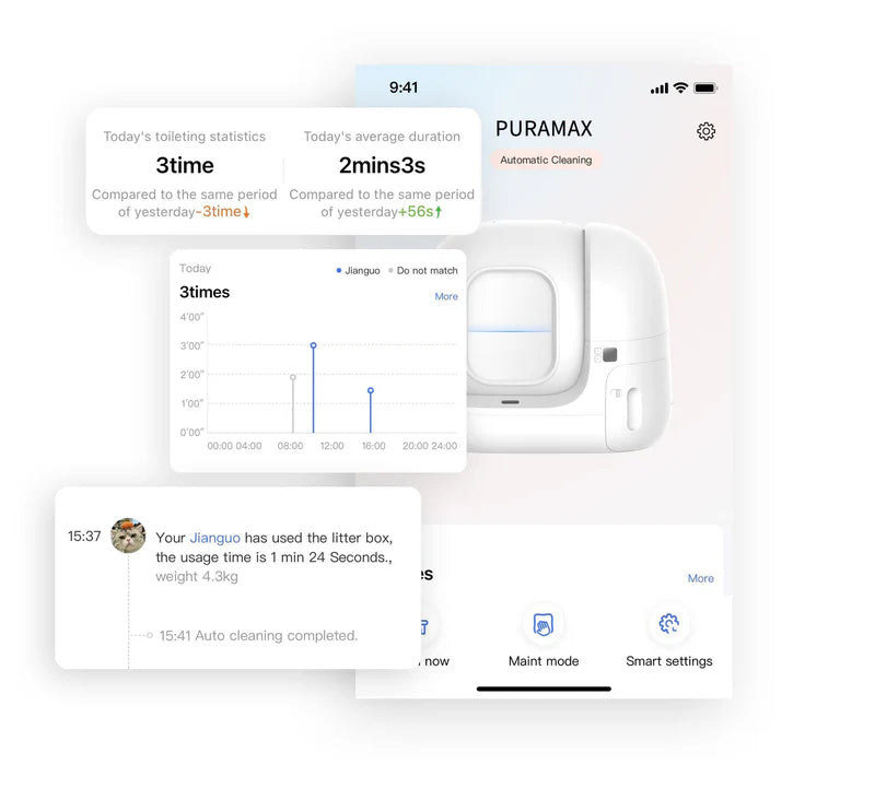 Real-time tracking of your pet's bathroom habits, as well as historical data analysis, to avoid urinary disease based on data on toilet usage, times, and duration.