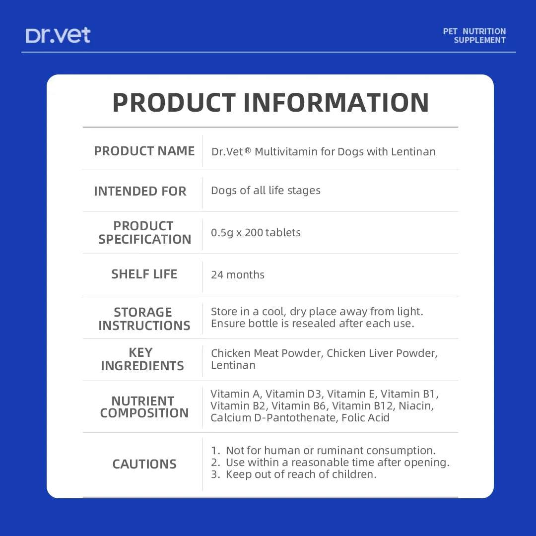 Boost your dog’s immunity and overall health with Dr. Vet Multivitamins for Dogs with Lentinan. This powerful supplement ensures your dog gets the essential nutrients needed to stay vibrant and active.