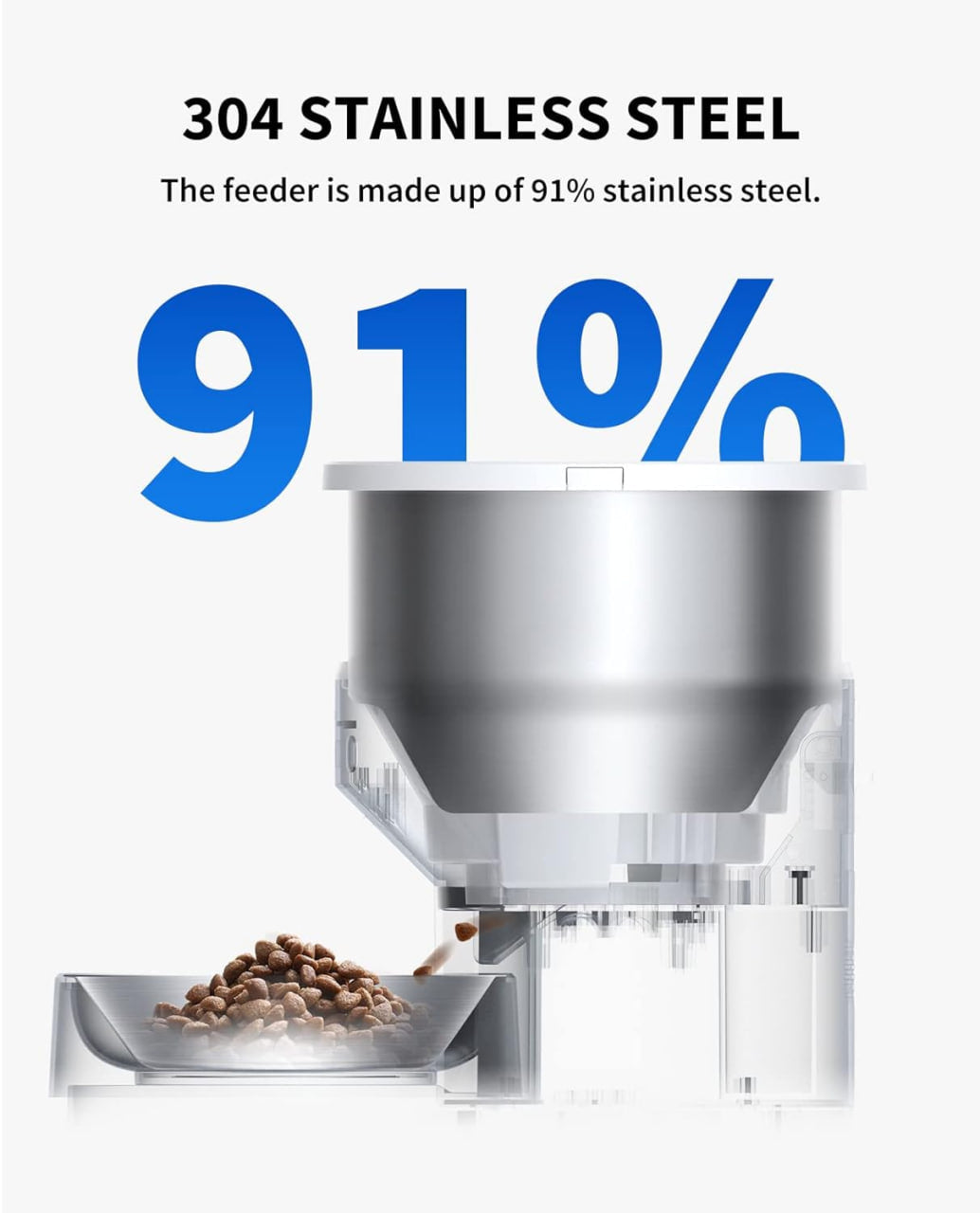 The food storage barrel and feeding bowl are both made of 304 food-grade stainless steel. It is durable and great for long-term feeding.