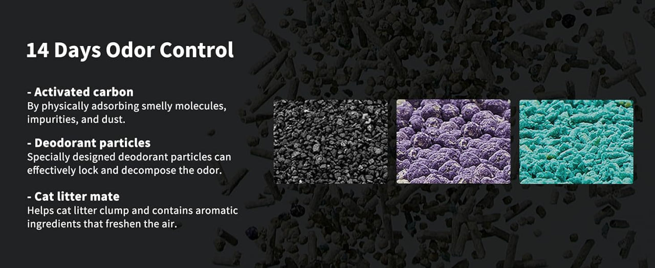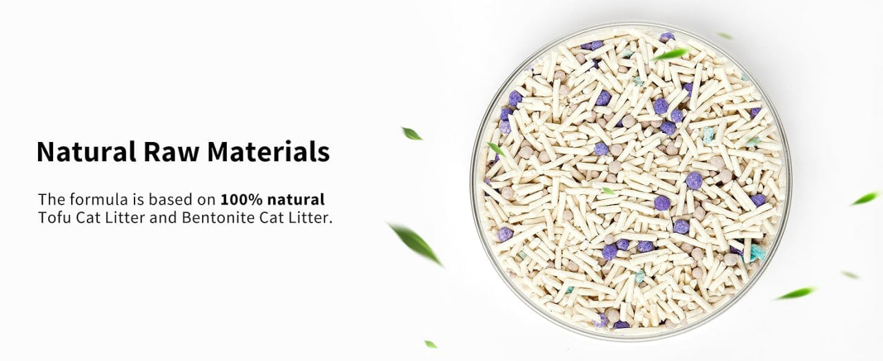 π― 5-in-1 Mixed Cat Litter: Made of all-natural ingredients,67.66% tofu cat litter and activated carbon(diameter 1.8β2.1mm,length 7-16mm), 29% bentonite cat litter(length 1.7β3.0mm), 2.91% litter mate(length 1.7β3.0 mm), and 0.43% deodorant particles (length 0.5β1.6mm).