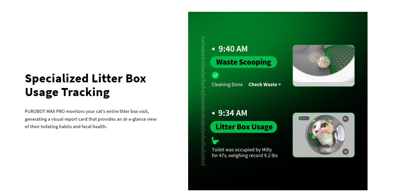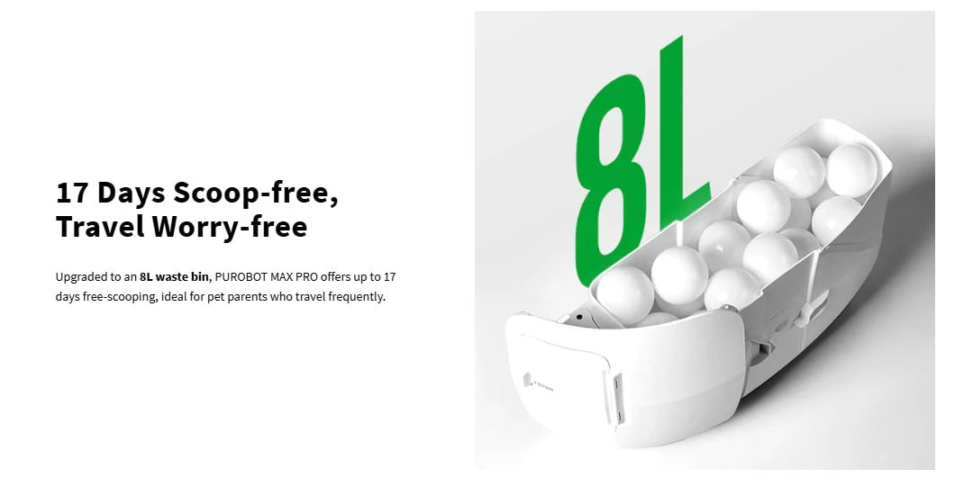 Extra Large Capacity & Super Quiet: 8L large waste bin allows up to 17 days of free scooping for one cat. Compatible with all cat litters. Ultra-quiet, the PUROBOT MAX PRO has a noise level of only 35-45 decibels, so even if you put it in your bedroom, it won't interfere with your quality of sleep!