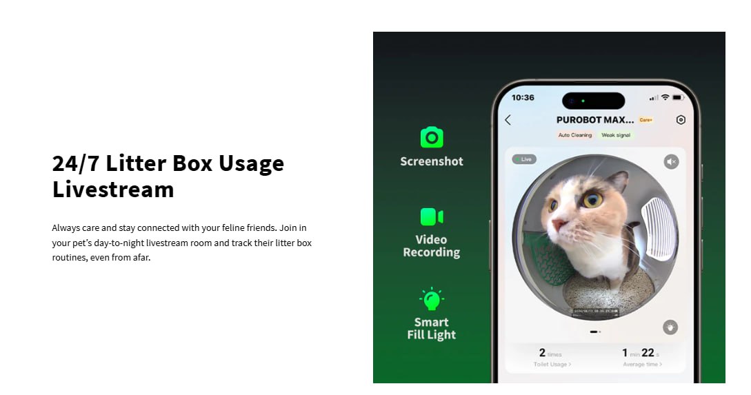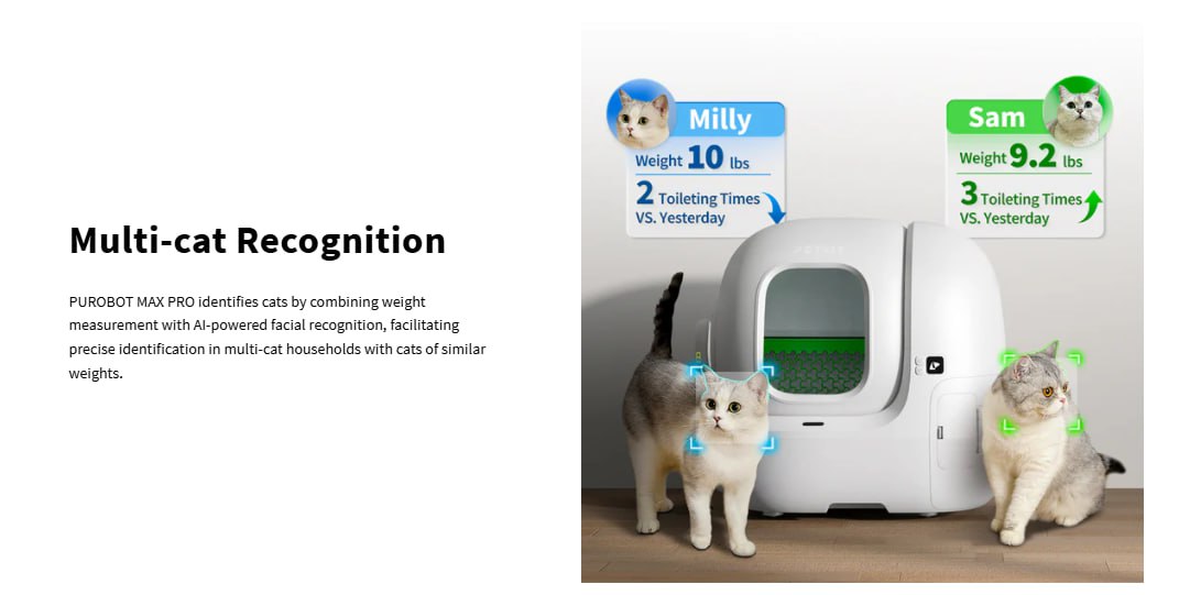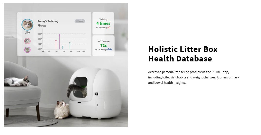 Smart App Control: PETKIT MAX PRO, which is 2.4&5GHz Wi-Fi enabled, you can easily connected to your smartphone via the PETKIT app. You can control the litter box and monitor your pet's activity and fecal condition in real time. Featuring multi-cat recognition, each kitten has its own unique data. The camera captures fecal images after each cleaning, and the app detects any abnormality, such as the color of the feces or the size of the clumps, early enough for you to take action in a timely manner.
