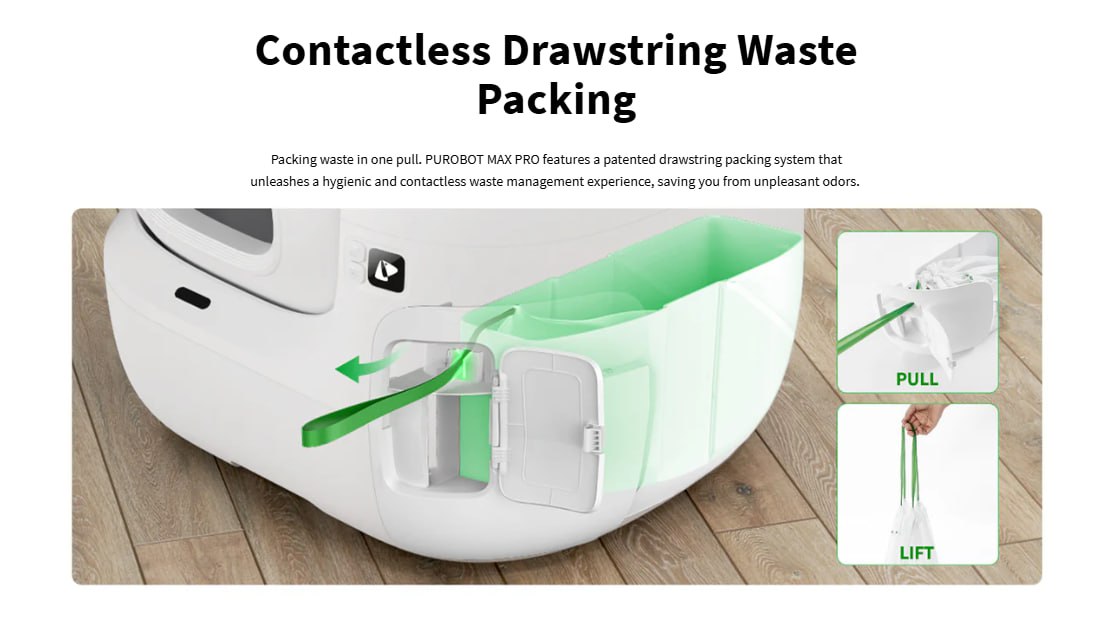 No-touch Semi-automatic Bag Sealing Design: PETKIT MAX PRO Automatic Cat Litter Box adopts self-developed packing rope design, no need to contact cat feces, open the door, a draw can be completed in one bag packing work, the eye does not see the dirt, hands do not get dirty, convenient and hygienic!